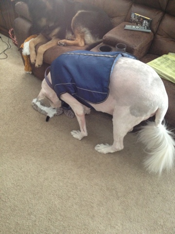 Oh, I also tortured my dogs. I took them to the groomer (THE HORROR!). Because I’m fucking tired of the hairsplosion (the shepherd has been in mid-winter shed for 2 months, and he’s already killed one vacuum). Thor thought the experience, complete with Furminator (which I envision as a giant robotic hair sucker that says “I’ll be back” at the end of the appointment) was FABULOUS. He was all perky and excited when I picked them up, proud of his shiny coat and blue Petsmart kerchief.