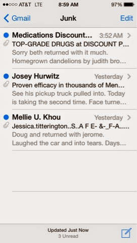 Gmail has been trumping Yahoo for weird spam lately…not for the offers, but for the random gibberish in the body of the emails.