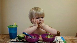 | Han is exhausted cleaning two barney-bowls of dinner. |