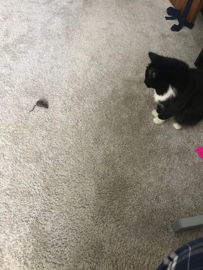 fAngus is a dick. And much like any human who deserves that descriptor, he’s PROUD of being one. He hounded that poor furry little disease carrying mouse all over the room, into the linen closet, into the guest bedroom, caught it again and brought it BACK into my office to drop it next to my desk and watch what happens. I am happy he hunts, because my house is old and traps aren’t always as effective as a little panther.