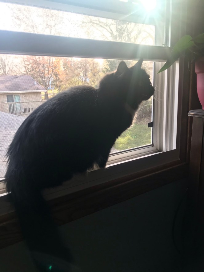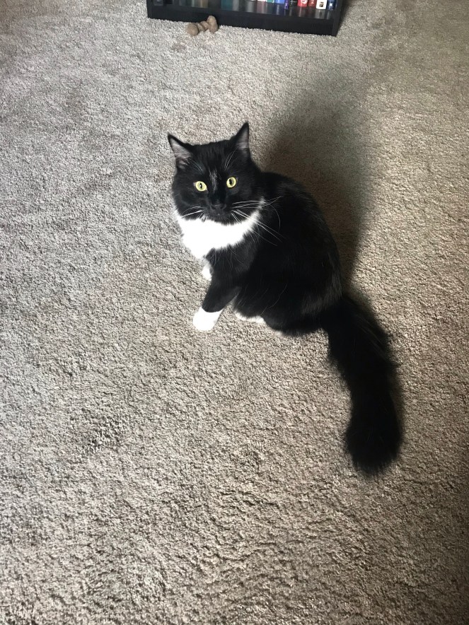 She “good boy’d” me and I went to plot my revenge nap in the dining room, on a white chair so I could roll and get it as covered in black cat hair as possible.