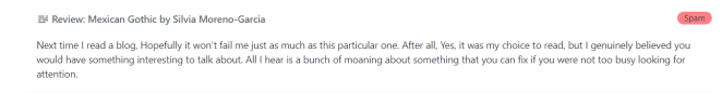 Manipulation often doesn’t work well on me anyway (I have zero patience for that sort of bullshit) and negging has never worked. In general, I figure if a person doesn’t like something about me, they are welcome to pick themself up and fuck right off out of my presence. Telling me my writing sucks in a spam comment that’s pushing your bot-driven ad attempts works about as well as a dude telling me my hair could look better or I could be more interesting or thinner at the bar. I mean, I’m not that arrogant: it’s entirely possible my writing on any given day does suck, but the message . What made me laugh out loud, though is the context of the comment and the post it the bot responded to: a book review of a gothic horror story that turned out to be wonderfully disturbing and I thoroughly enjoyed. Happy to fail you with my review, weirdo spambot. Off you toddle.