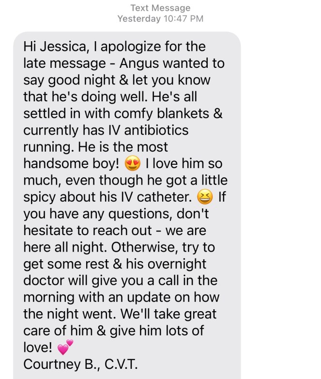 The first text update and pic came that night at bedtime. They gave him fluids and some anti-nausea meds. That dropped his blood protein percentage further, but the morning doc said that’s expected.