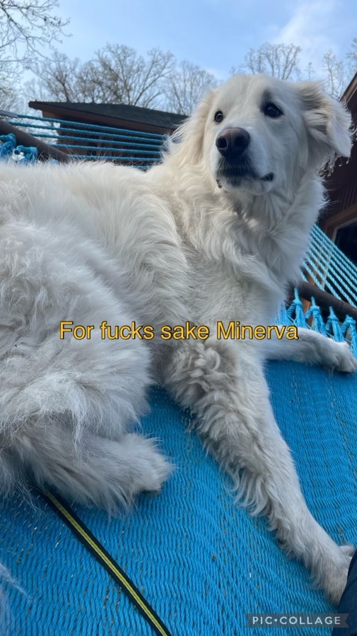 Since Minerva is the Roman goddess of war and wisdom, I feel it’s important to point out FFS Minerva is goddess of barking at random noises and leaves, peeing on carpets, and shedding fine white hair in both fluffy tufts and constant airborne velcro-like strands. FFS Minerva is, by virtue of her prodigious ability to send her spy-hair everywhere, quite well traveled. I assume there are nanos in there and she’s expanding her network exponentially, but I haven’t unlocked the ability to download her spy information yet. It likely has something to do with rubbing her belly, which is her default position setting.