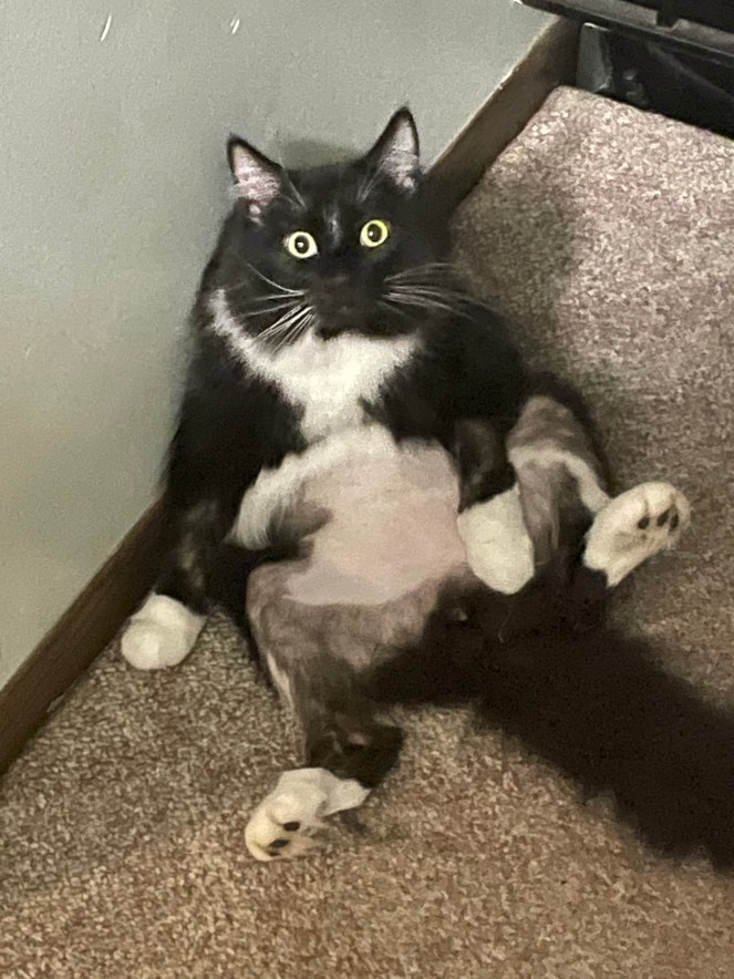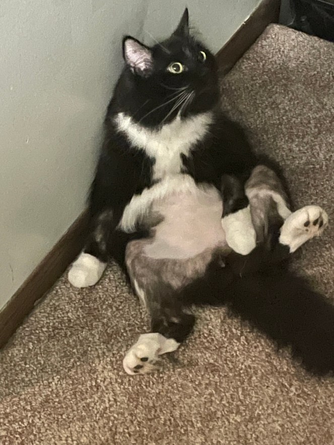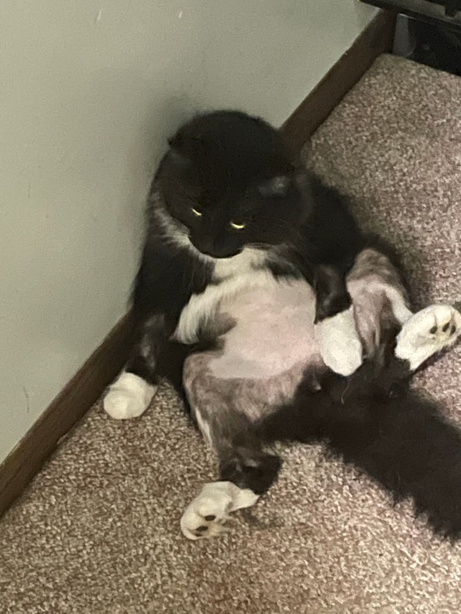 FTR: fAngus is medically healthy but he’s been doing some barbering since he moved into this house, partially out of the stresses of change/moving and partially because he’s a goober who runs through burrs when he’s exploring outside. Sigh. We’re working on determining how to alleviate his stress so he feels better, but this moment was funny as hell.