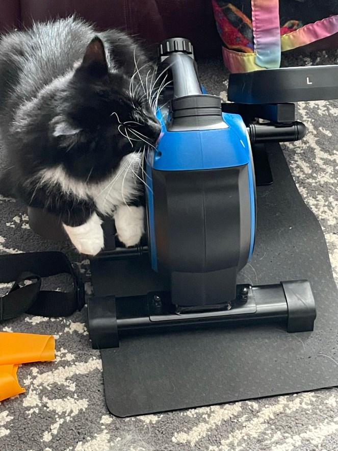 I’m not in the office much anymore (where I tend to get up and move around more simply because the kitchen and bathroom aren’t 5 steps from my desk) and won’t be after tomorrow, so I bought myself an under-desk elliptical machine to try to at least get some movement while writing.