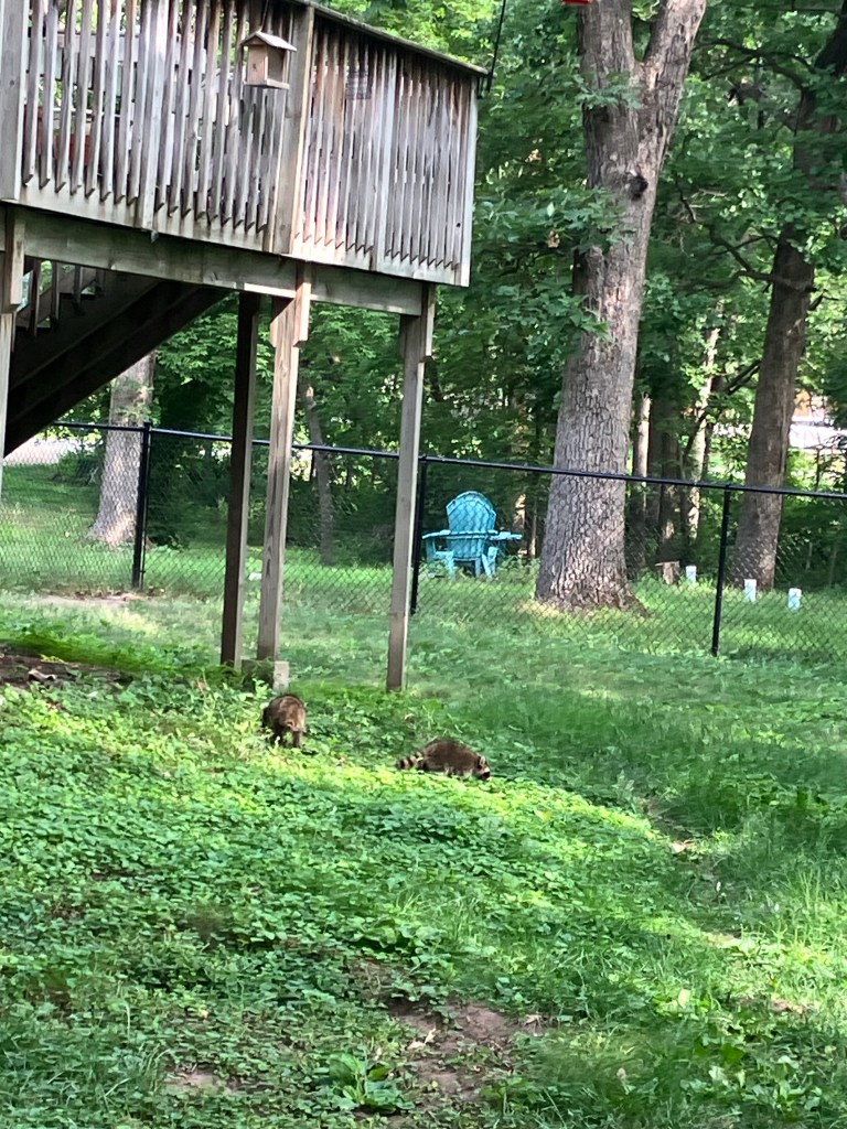 Butterfle, who spends most of her free time on the swings, had an excellent view. She warned us not to let the dogs out and took the picture above. Later she gave us the all-clear, because while I don’t really want raccoons hanging out around here, I also don’t want to clean up a bloodbath in the dogs’ yard. They’re just babies…I just want them to move along.