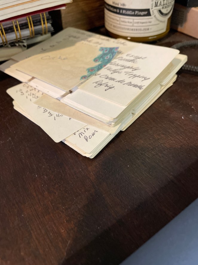 When SK’s lovely mother passed last summer and the monumentally difficult (in all the ways) task of handling her estate and house began, I offered to take her rolodex of mostly handwritten recipes and put them together in a book for everyone for Christmas. Around Samhain I realized time was quickly running out for getting that done on time, so I’m taking a 2 week pause to write, photograph, and collate into cookbook sections the pile of family recipes. SK found a few from his grandmother to include as well, so I’ll add a section for Grandma Ida recipes. It’s not difficult work, but it’s detailed and can be a little putzy. However, by putting the novel on hold for those two weeks and giving myself permission to take that pause, I’ve gotten through this pile as of this morning: