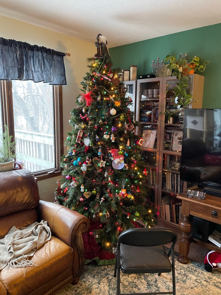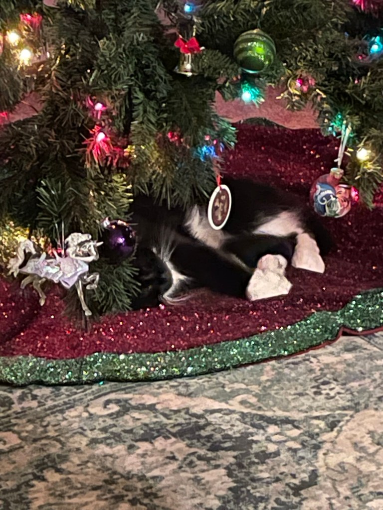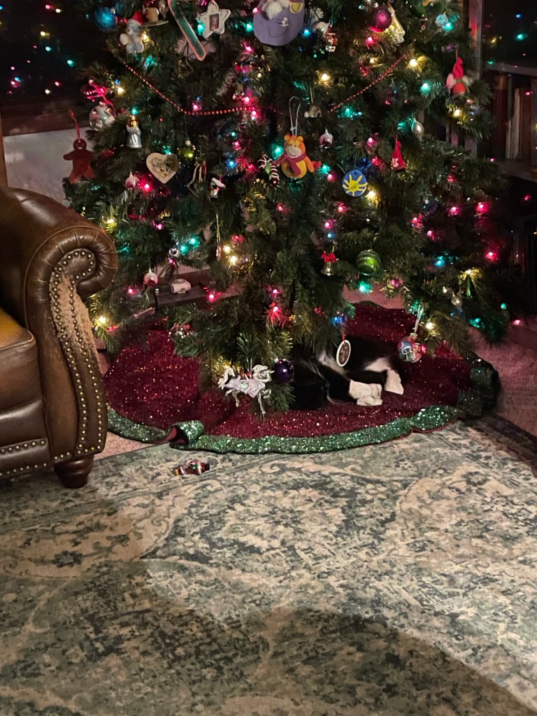 The horde decorated the trees yesterday, and now we are existing during fAngus’s favorite time of year: he can get completely high on catnip (the poor catnip plant may not survive the winter) and stare at multicolored lights or nap under the tree like the gift he’s confident he is.